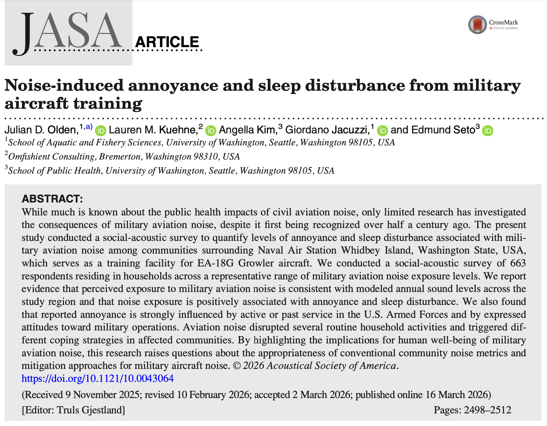 During the recorded webinar (above), Sound Defense Alliance hosted guest researchers to share results from two recent studies on how military aviation affects residents of western Washington. The first study shared results from a randomized survey conducted in 2024 to evaluate the intensity and type of impacts reported by residents, as well as better understand the role of “non-acoustic factors” in evaluating noise. The second analyzed seven years of noise complaint data to compare geographic trends in complaint data with noise contours, and to capture the range of impacts on both health and quality of life. Both of these studies are designed to capture and reflect the lived experience of military aviation on communities, advancing science needed both globally and to support communities in Washington State.